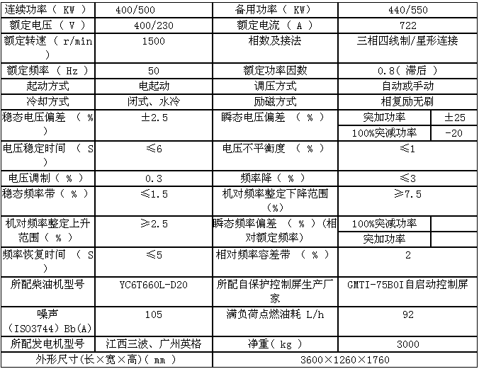 400KW柴油發(fā)電機組主要技術參數(shù)